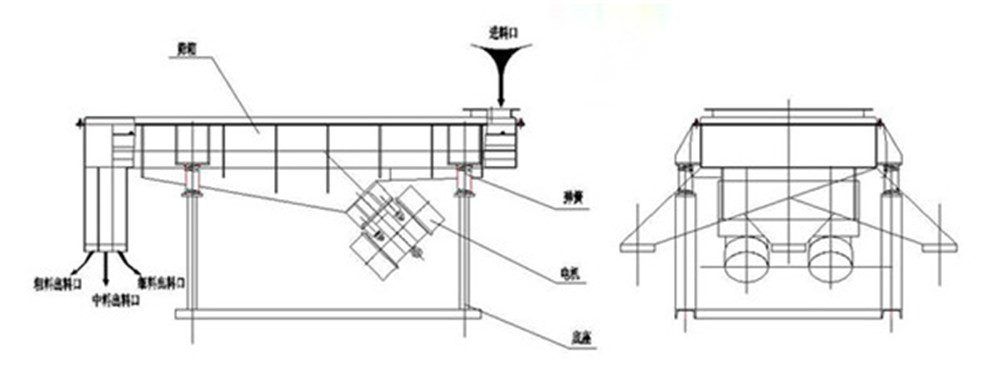 直线振动筛由双振动电机驱动。当两台振动电机同步、反向旋转时,偏心块产生的激振力在平行于电机轴线的方向上相互抵消,并沿垂直于电机轴线的方向叠加。因此,筛机的轨迹是一条直线。两个电机轴相对于筛面具有倾角。在激振力和物料自重的共同作用下,物料在筛面上被抛起向前跳跃作直线运动,从而达到对物料进行筛分分级的目的。可用于实现流水线中的自动化作业。具有能耗低、效率高、结构简单、维修方便、全封闭结构、无粉尘外溢等特点。筛目数为0-120目,可筛出7种不同粒度的物料。