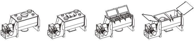 5.多样的开口方式 混合机的筒盖上可设置不同形式的开口,满足不同的工况下使用。依照开口作用可设置人孔、清理门、投料口、排气口、